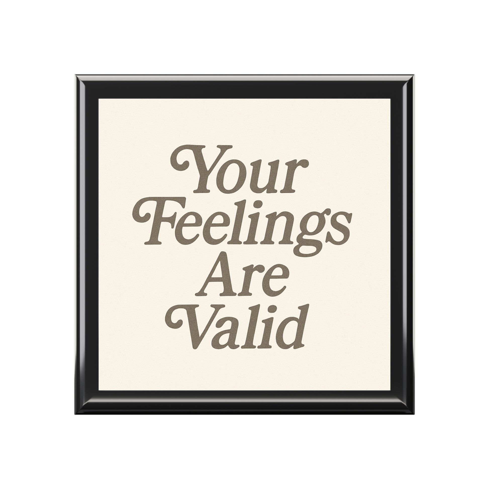 A stylish and functional jewelry box with a glossy finish, personalized with an 'Your Feelings Are Valid' affirmation message. Perfect for her as a keepsake and self-care decoration. Ideal for those looking for a thoughtful and practical gift for birthdays, holidays, or self-care occasions.