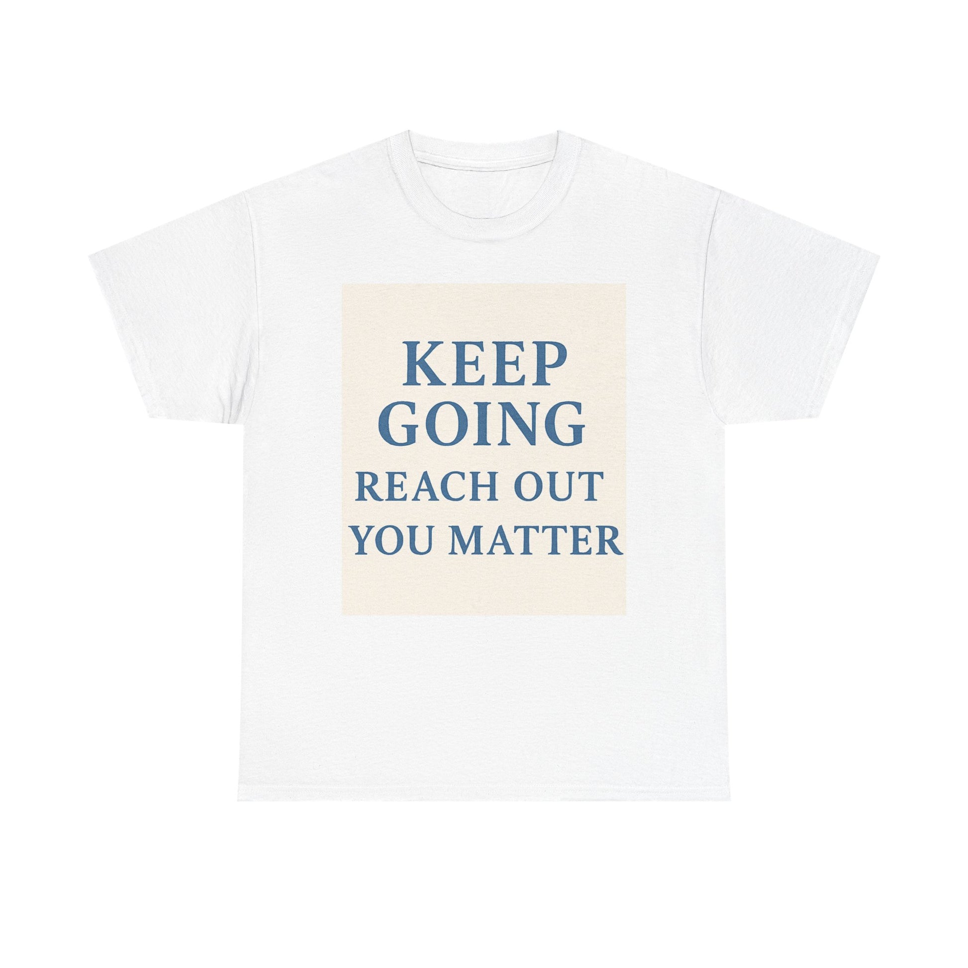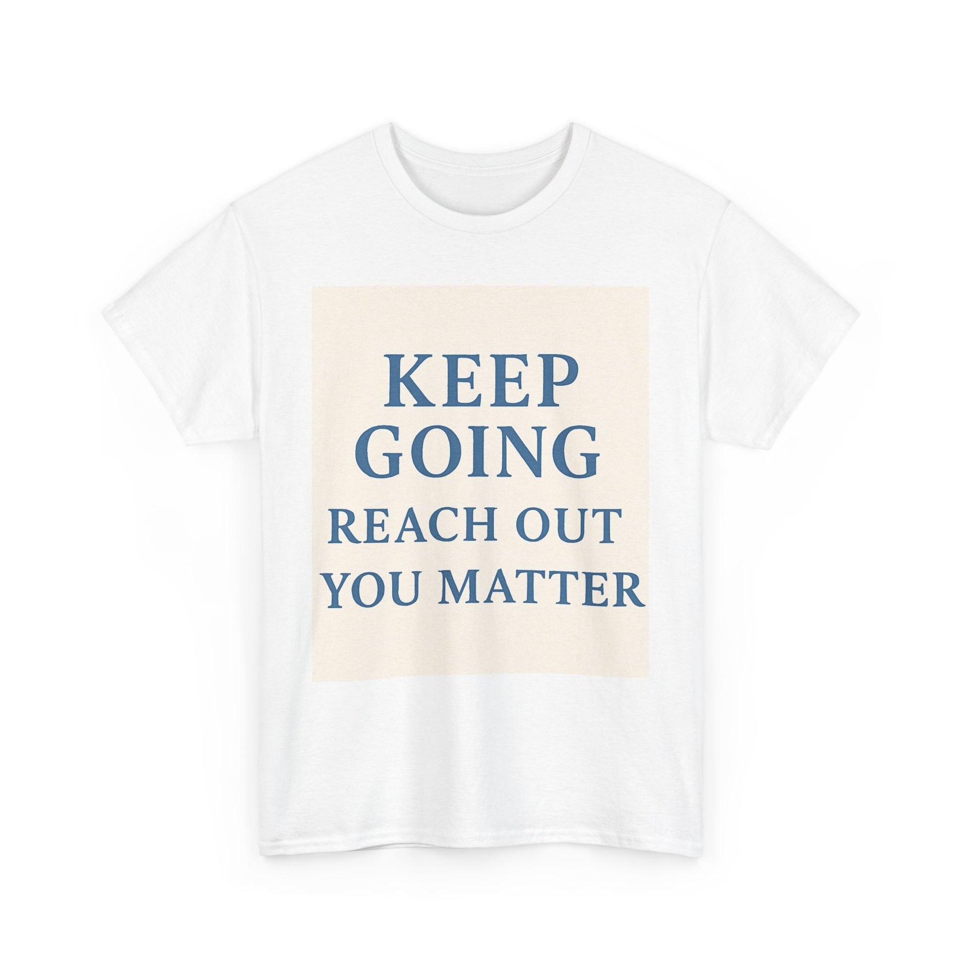 This unisex heavy cotton tee is a perfect blend of comfort and style, radiating positivity with its uplifting message: "Keep Going, Reach Out, You Matter." Crafted for individuals who appreciate both casual fashion and powerful affirmations, this tee invites a sense of warmth and community. Ideal for anyone looking to inspire themselves or others, it's great for everyday wear, casual meet-ups, or gatherings aimed at mental health awareness. The vibe is relaxed yet meaningful, making it a thoughtful gift for friends or family during any occasion—from birthdays to motivational events and even just because. Wear it while lounging at home or out with friends, as a reminder that support and connection are always important.